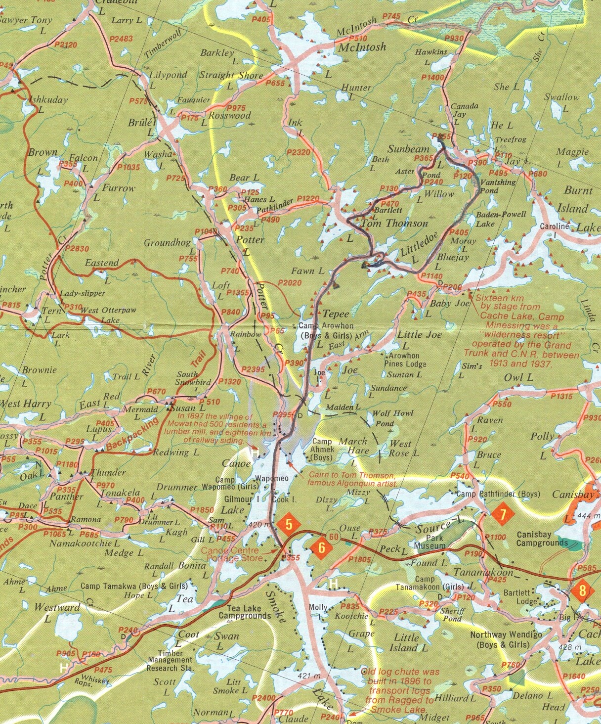 It was mid July when we entered the park on Route 60 from Whitney. Shortly thereafter we saw a juvenile Moose feeding along the roadside. This trip would prove to be great for seeing wild life. Click on the map to the left to see our proposed route from Accces Point 5 on Canoe Lake to Sunbeam Lake, returning via Tom Thompson Lake..